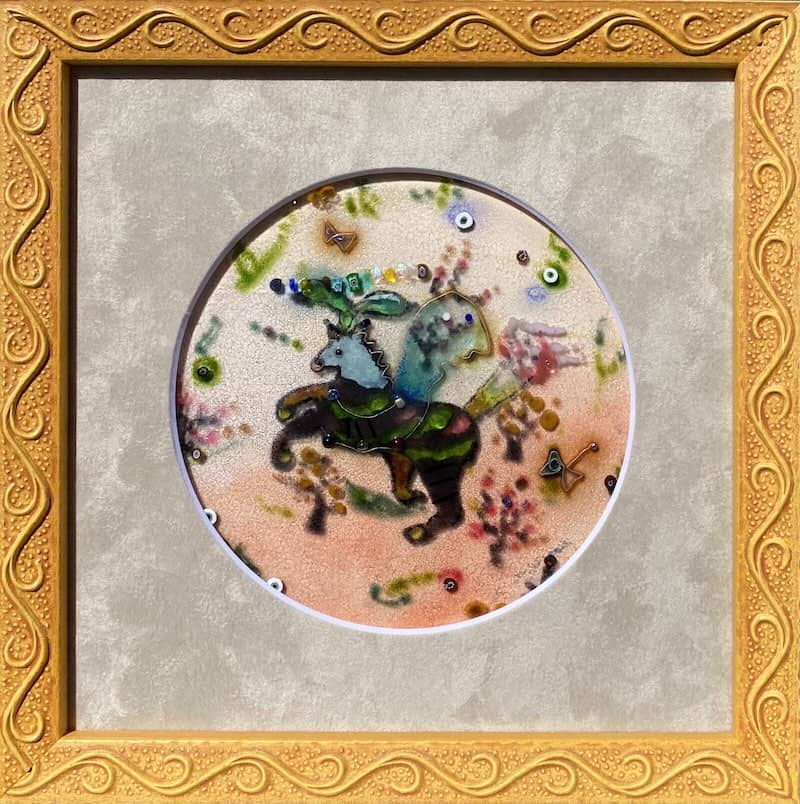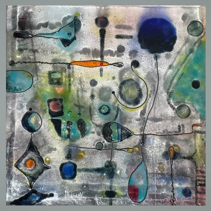 絵画とガラスを組み合わせたオリジナル技法の作品を制作している。