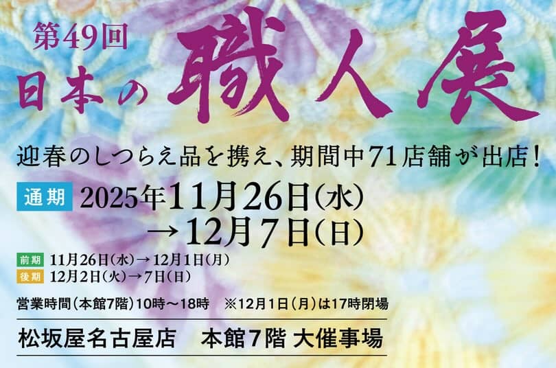 「日本の職人展」とは、 全国の伝統工芸品や職人技が光る商品が集まる松坂屋の催事です。長谷川淑子七宝工房のブースは、この催事場にあります。